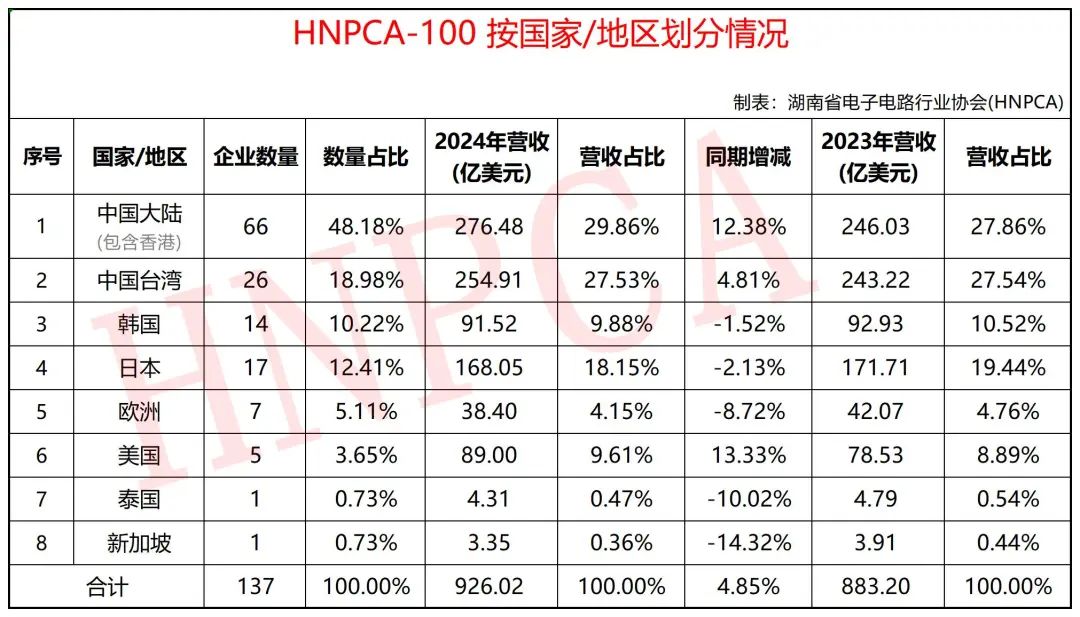 ①.中國(guó)大陸(含香港):66家,占比48.18%;總營(yíng)收為276.48億美元,占比29.86%,同比增長(zhǎng)12.38%;